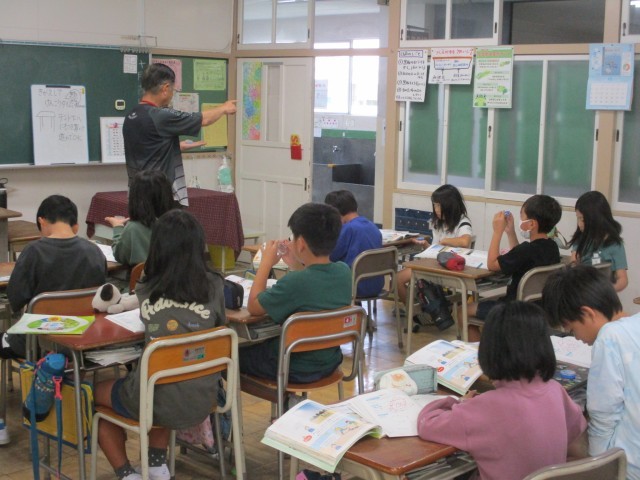 3年生の理科の授業の様子です。方位磁針を使って、方角を確認する方法を学んでいます。