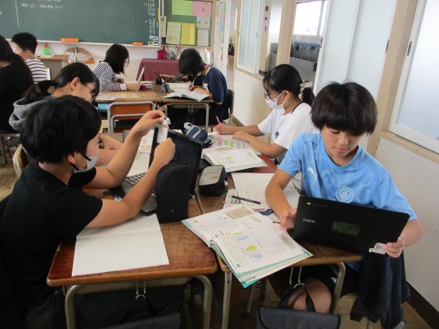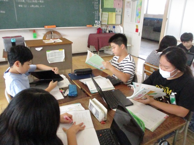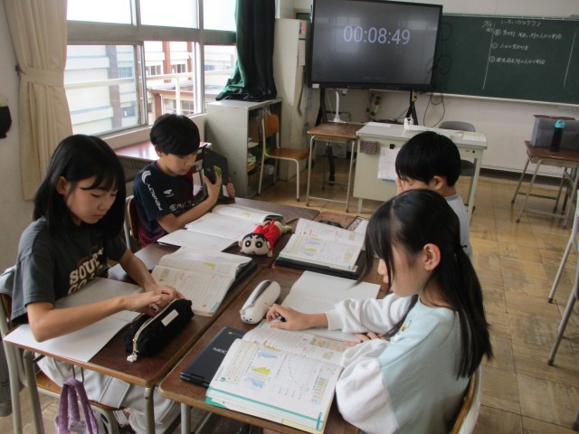 6年生の算数の授業の様子です。グループで相談しながら、いろいろなグラフを使って問題を解いています。