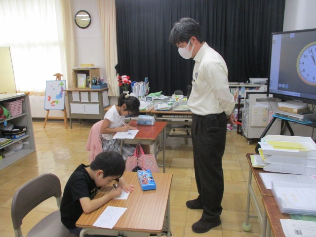 ふれあいの授業の様子です。「のばすおんの書き方をおぼえよう」「どんなお話しか考えよう」と、それぞれのめあてをもって学習に取り組みました。