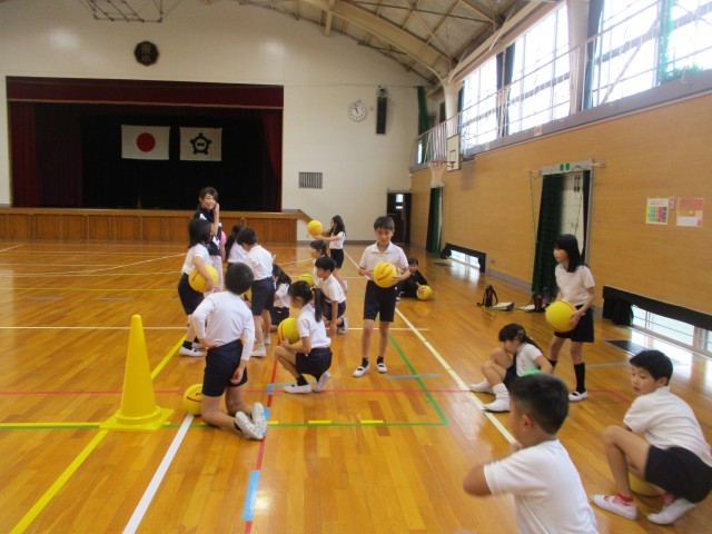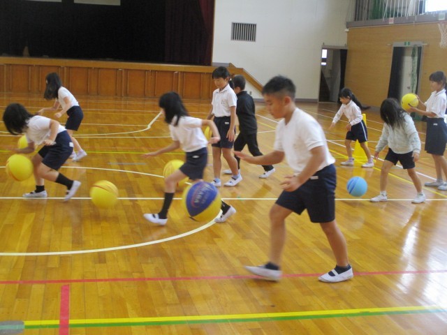 3年生の体育の授業の様子です。ソフトバレーボールをつかってドリブルの練習をしました。
