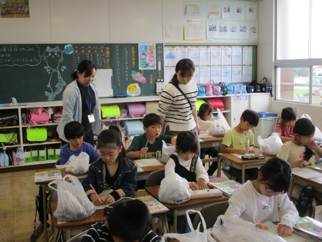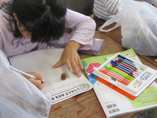 1年生は、公園で秋見つけをしたことをカードにまとめました。拾ったドングリをみながらまとめたりもしました。