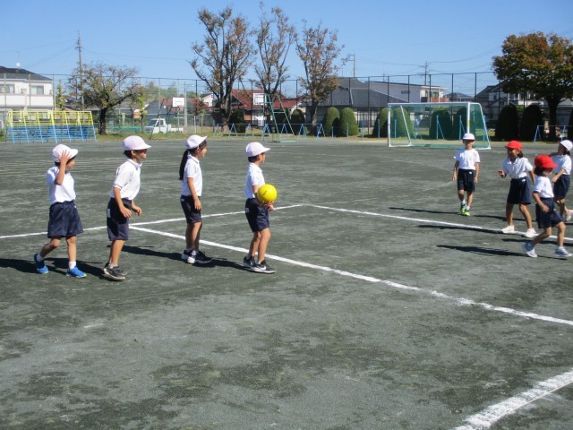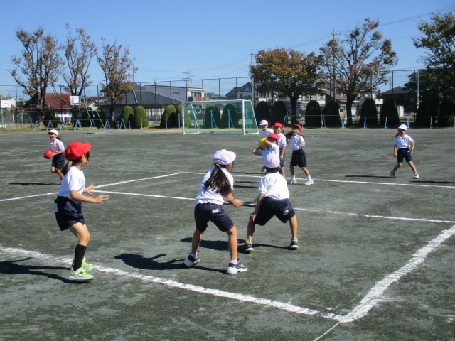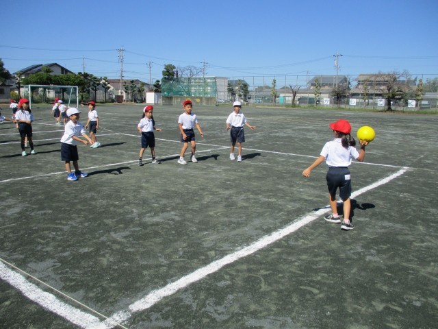 体育では、運動場で「ボールなげ遊びゲーム」の学習をしています。今日はドッジボールをしました。ルールを確認し、楽しくゲームに取り組むことができました。
