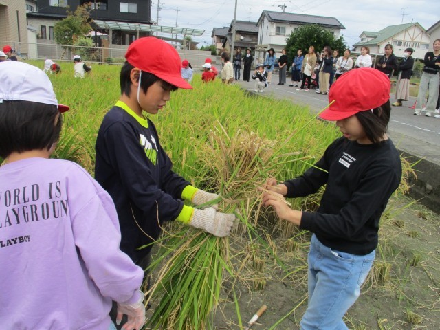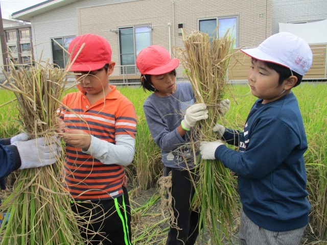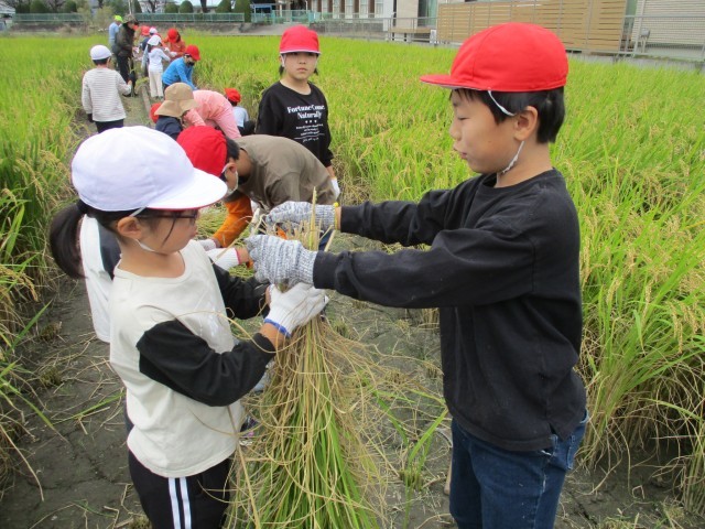 4年生は本年度の稲刈り大会から高学年の仲間入り。今までお兄さんお姉さんがやってくれていた役割を担当しました。鎌で稲を刈るのは初めてでしたが、どんどん上達し、横一列にきれいに刈ることができました。稲を束ねる作業は練習を思い出しながら、2年生と協力してぎゅっと力強く結ぶことができました。食べ物への感謝の気持ちと、ペアの2年生との仲が深まったよい経験となりました。稲を育ててくださった地域の皆様、ボランティアとして手伝ってくださった保護者の皆様、参観してくださった保護者の皆様、本当にありがとうございました。