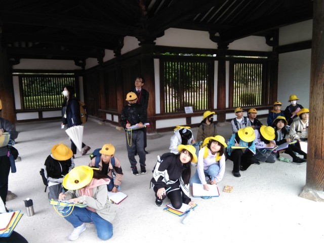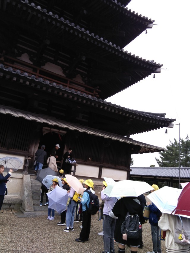 法隆寺に着きました。残念ながら、ポツポツと雨が…。