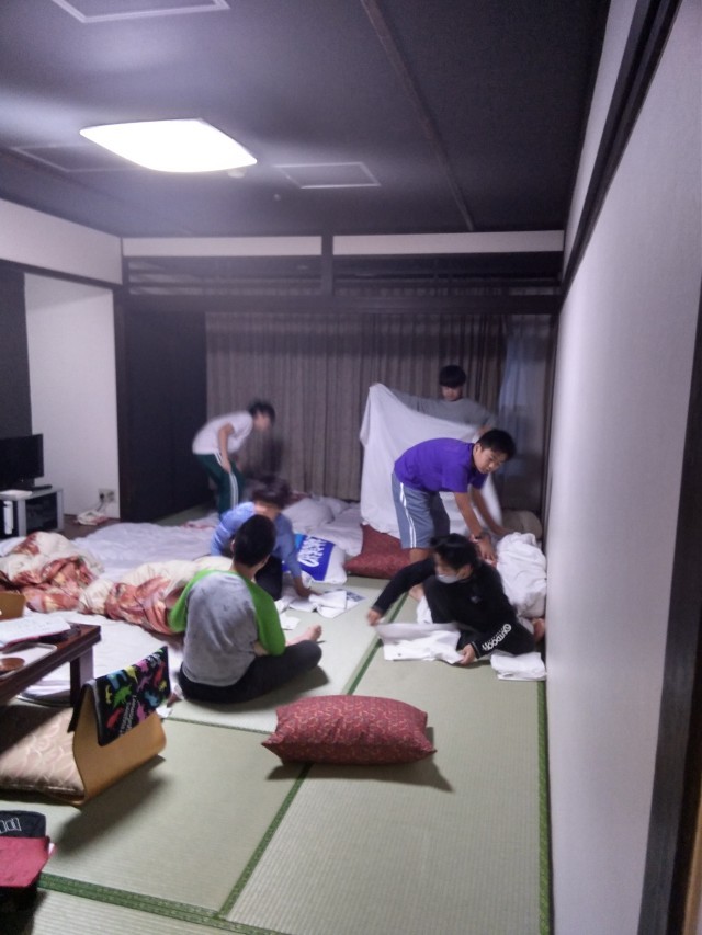 「おはよう!」のあいさつと共に、早速お布団を畳んで、出発の準備を始めた班も。部屋チェックは、6時半です!