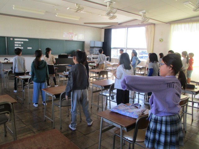 4年生の音楽の授業の様子です。発声練習をして、歌う準備を整えています。