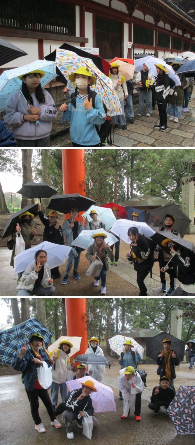 6年生 修学旅行 思い出の1ページ(東大寺・奈良公園) 公開日 2025/11/12 更新日 2025/11/12 6年生の部屋 修学旅行1日目の東大寺・奈良公園での様子です。残念ながら大雨の中での散策となりました...。
