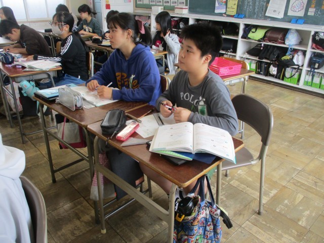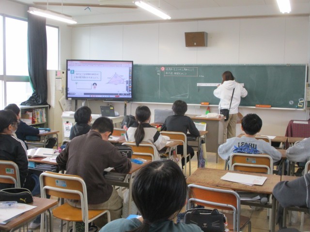 6年生の算数の授業の様子です。四角形を2つの三角形に分けて、拡大図、縮図を書く練習をしました。