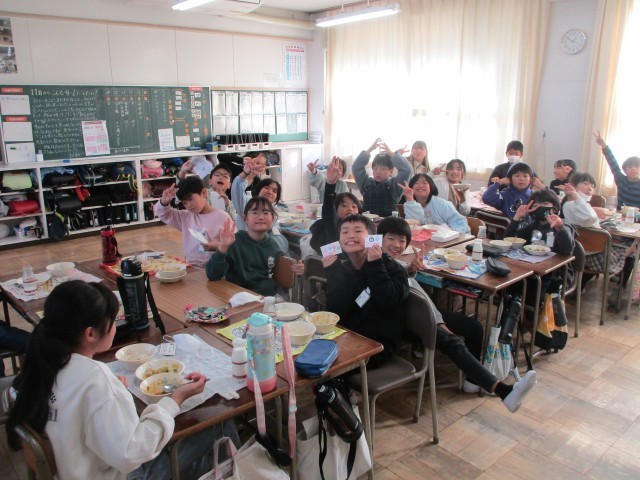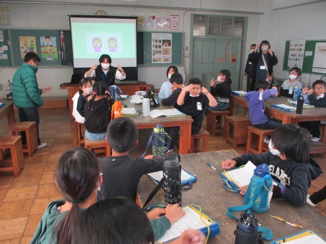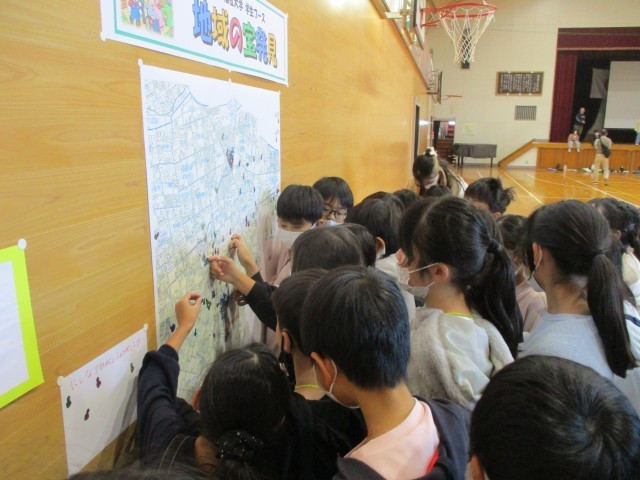 本日の福祉イベントでは多くのことを体験させていただきました。手話体験では基本的なあいさつの仕方を学びました。また、地域の宝発見では、学校区の好きな場所にシールを貼りました。4年生と2年生のペアの子たちも一緒に仲良くいろいろなブースをまわりました。給食の時間には、イベントで仲良くなった学生さんたちと過ごしました。