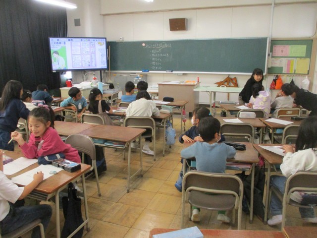 2年生の生活科の授業の様子です。絵を入れたり、線を引いたり、文字の大きさを変えたりして、記事の書き方を工夫しています。