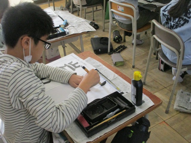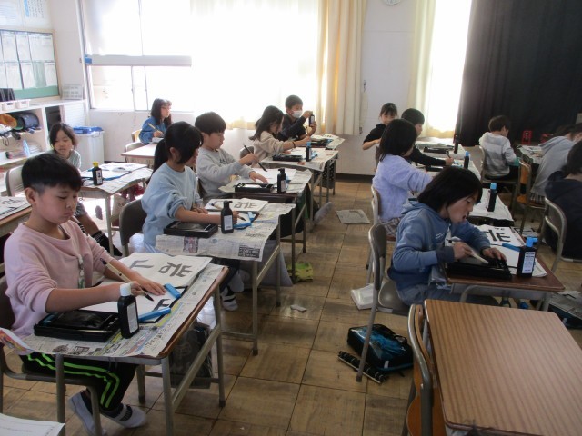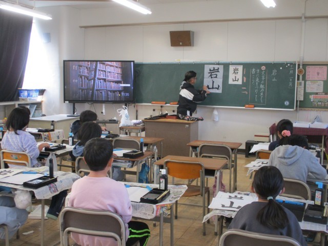 4年生の書写の授業の様子です。文字の組み立て方に気を付けて、ていねいに「岩山」を書きました。