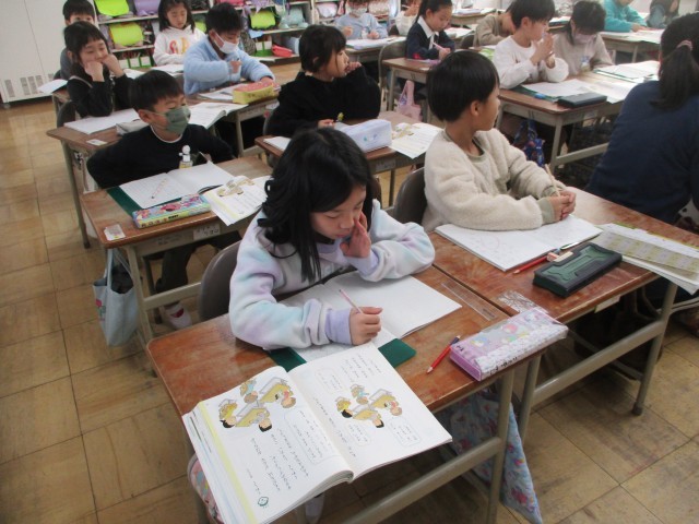 今日の国語のめあては「詳しく聞きたいことを考えて聞こう」です。自分で好きなお話を決めて、その登場人物やおもしろいところをノートにまとめました。