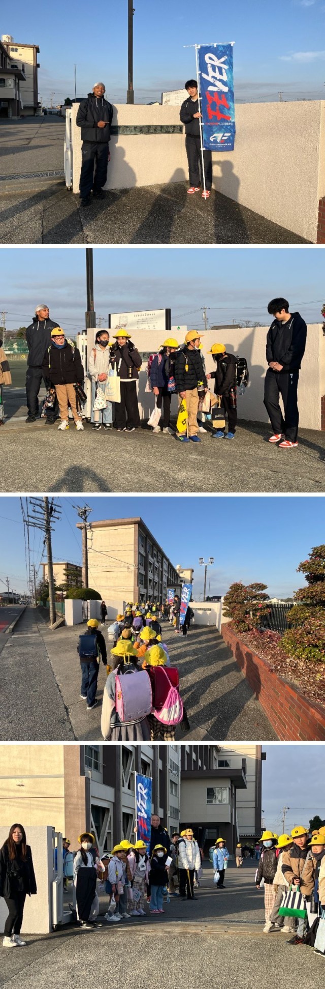 本日は、B.LEAGUE所属のプロバスケットボールチーム「ファイティングイーグルス名古屋」の選手・フロントスタッフの方が、本校あいさつ運動に来てくださいました。子どもたちのあいさつボランティアメンバーも一緒になって盛り上げ、いつも以上に活気ある一日のスタートとなりました。