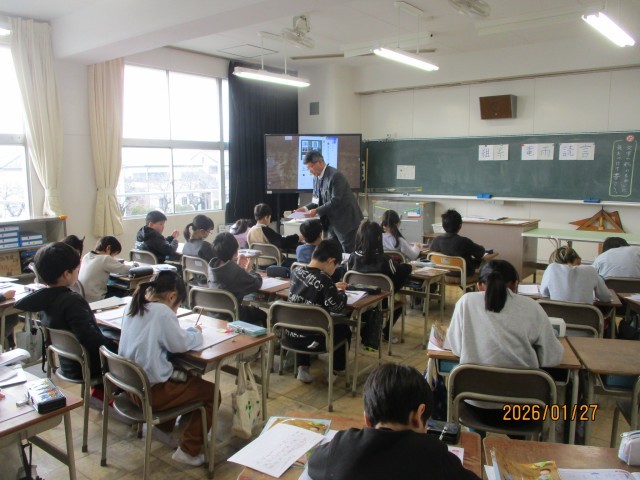 2年生の書写の授業の様子です。文字の形の違いに気を付けて、ていねいに書きました。