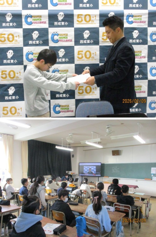 たくさんの人の「支え」があったからこそ、今の皆さんの成長があります。今のクラスで過ごせる時間は残りわずか。ぜひ「ありがとう」を言葉にして伝えてほしいと思います。恥ずかしくて言いにくい時は、心の中で唱えるだけでも、相手に優しく接するだけでも構いません。感謝の気持ちを大切にできる人は、オリンピックの選手と同じくらい、キラキラと輝く「心のメダル」を持っている人だと、校長先生は思います。今、西成東小では、あいさつジュニアの子たちが、もっとあいさつを盛り上げようと頑張ってくれています。そして、その想いに応えようと、たくさんの人たちがあいさつ運動に参加してくれています。20ポイントたまったときのご褒美は、校長先生のサインといった話もありましたので、廊下の掲示物で先生のサインを紹介しました。そのサインに隠れたメッセージに気付いてくれた子もいましたね。夢という漢字を「ありがとう」五文字で表したのが、先生のサインです。最後まで頑張って運動に参加してくれた子は、ぜひ校長室に来てくださいね。ありがとうの気持ちを思い切り込めて、サインを書きます。では、終業式まで、感謝の気持ちを忘れずに、みんなで最高の締めくくりをしましょう。