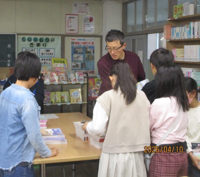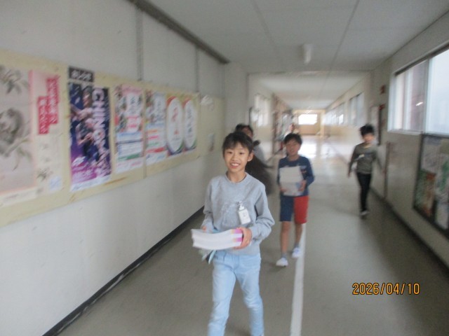 図書館から新しい教科書を運ぶお手伝いです。みんなのために、重い教科書を教室まで運んでくれました。これからどんな勉強をするのかな?ワクワクしますね。