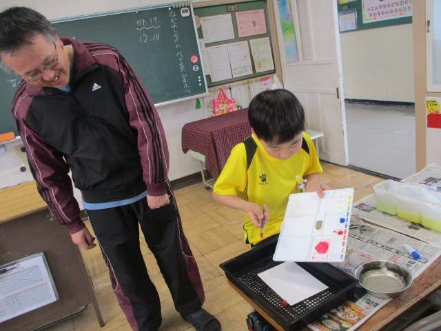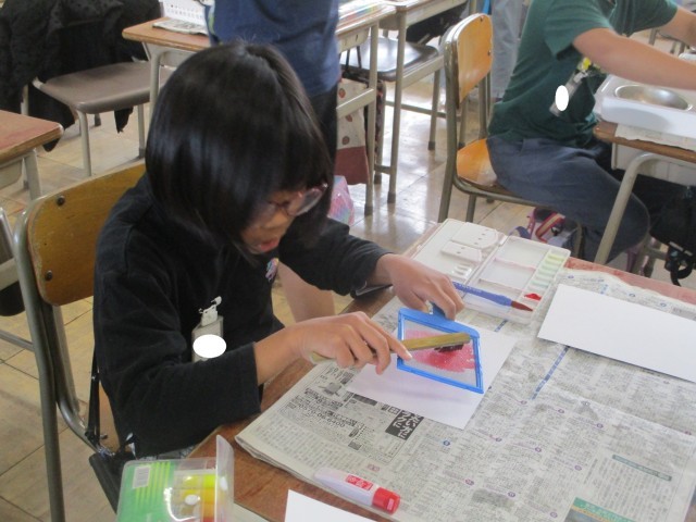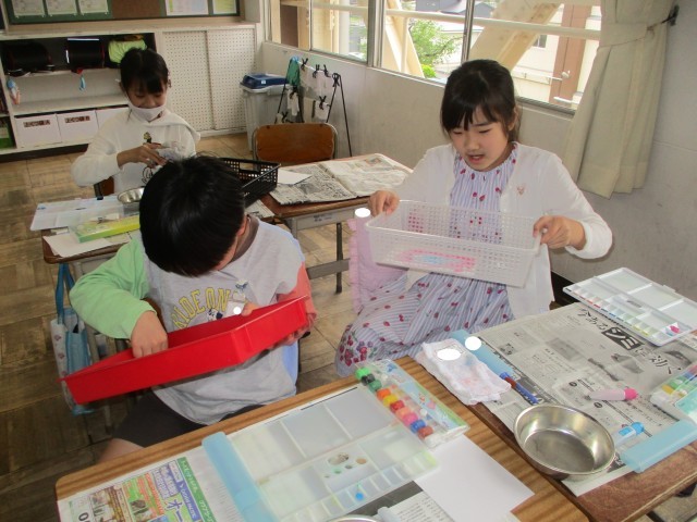 ブラシで網をこすったり、ビー玉に絵の具をつけて紙の上で転がしたりと、いろいろな方法で模様を描いて楽しみました。