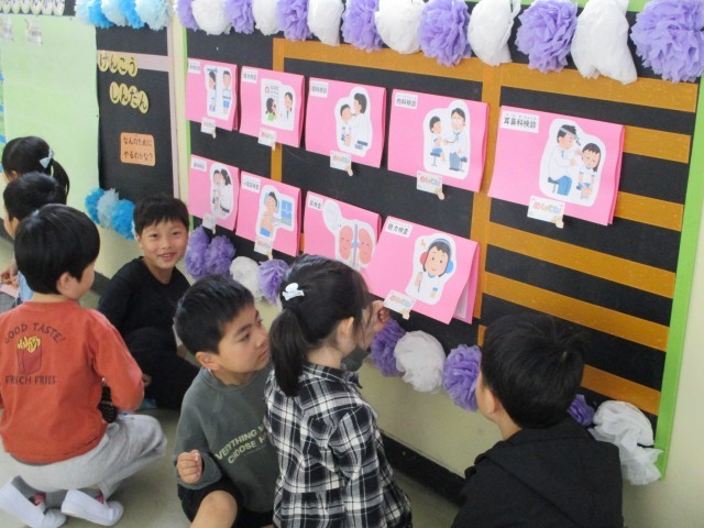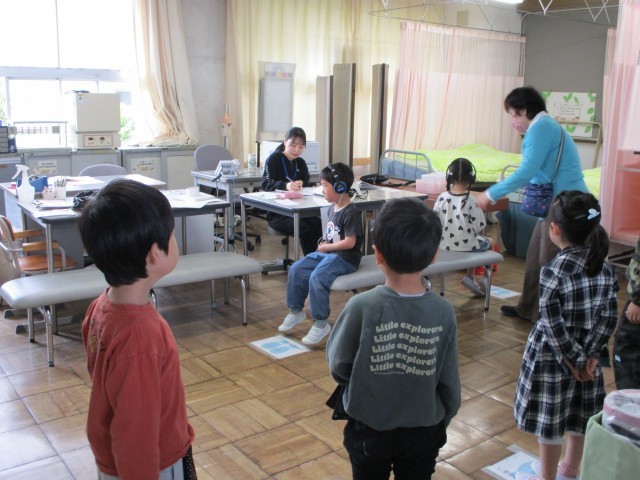 今日は保健室で聴力検査を受けました。ヘッドホンをつけ、真剣に小さな音を聴いてボタンを押していました。また、廊下にある掲示を見ながら、静かに順番を待っていました。