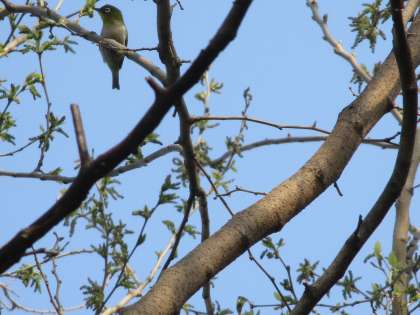 大きな桑の木にウグイスがやってきました。本当にきれいなウグイス色をしています。鳴き声は、みなさんがよく知っている「ホーホケキョ」ですね。