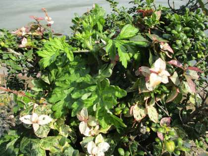 次の写真は、ツゲの木の間からヨモギの葉っぱがのぞいています。草もちにいれると、とても美味しいですね。