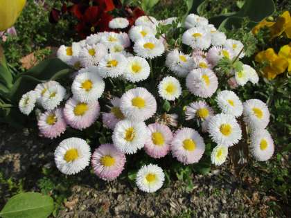 ○ 南うんどうじょうの かだんに さいています。(ヒナギクともいいます。)