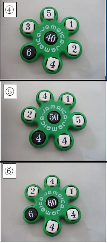 2.白のサイコロ5つすべてを使って、さきほどの黒の答えになるように計算をする。四則演算(たし算・ひき算・かけ算・わり算)なんでも使えます。まだ習っていない学年もありますが、もちろん( )も使ってよいです。