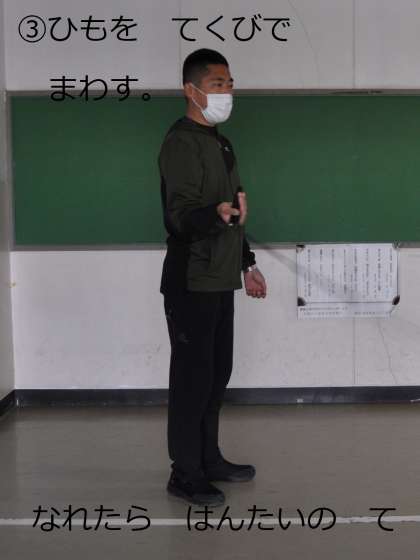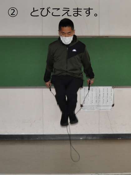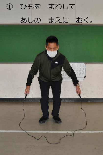 さいしょは なわを あしの まえに まわして、ひもを とびこえられれば オッケー!