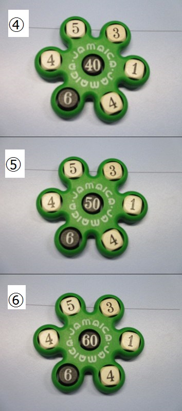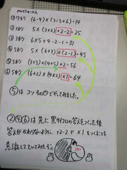 2.白のサイコロ5つすべてを使って、さきほどの黒の答えになるように計算をする。四則演算(たし算・ひき算・かけ算・わり算)なんでも使えます。まだ習っていない学年もありますが、もちろん( )も使ってよいです。