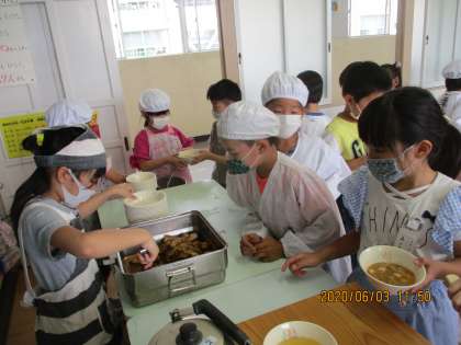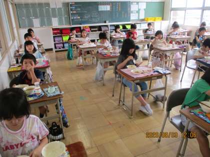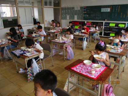 コロナ対策の給食が始まってから、今日で三日目です。基本は「配膳をせず、自分のものは自分で取りに来る。」です。また、「会食の時は、会話をしないで前向きで食べる。」です。慣れてくると、これまでの給食よりもスムーズで安全に準備と片づけができることがわかりました。