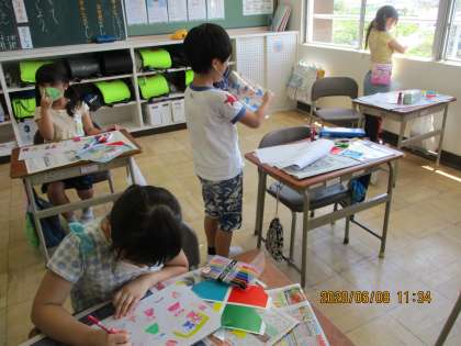 図工の「光のプレゼント」では、透明のプラスチック板に、シールや油性マジックで好きな模様を描きました。そして、作品を日光やプロジェクターの光に当てると、美しい色の影を楽しむことができ、「きれい」「すごい」などの歓声があがりました。