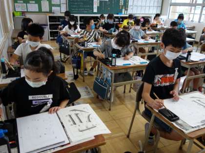 姿勢や筆の持ち方を復習した後、基本的な筆の運びを練習していました。
