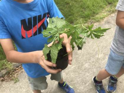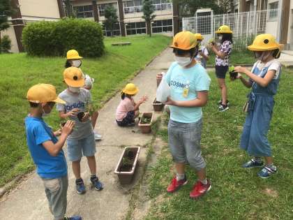 ツルレイシの間引きを行い、学校で育てないツルレイシを希望する児童に配布しました。おうちでも育てて立派な実をさかせてくださいね。