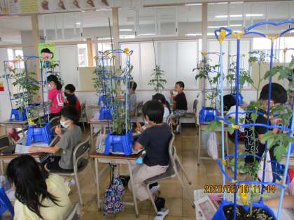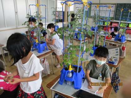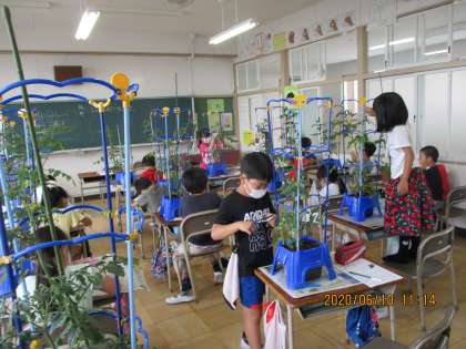 生活科の「やさいをそだてよう」の単元で、ミニトマトの観察をしました。教室へ持ってきて、全体の高さや実の数・花の数・葉っぱのにおい・葉っぱをさわった感じなどを調べて記録しました。また、実のつき方も詳しく絵に表現することができました。
