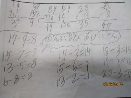 写真1:計算の練習(式を先につくるのではなく、答えが○○になる計算を考えたところが素晴らしいです。)