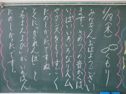 今日は、3時間目に2回目の音楽を行いました。鑑賞曲に合わせて身体表現をする学習です。音楽を聴いて体を動かすことは、とても自然なことです。激しい曲や穏やかな曲によって、子供たちは様々な表現をしました。次回のさらなる進化した表現が楽しみです。