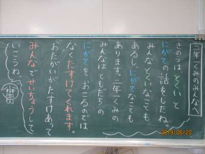 1組の教室では、友達ができていないことを責めるのではなく、寄り添ったり助けたりする姿がよく見られます。そこで、子ども達には「人間は誰もが得意なことも苦手なこともあるよね。友達の苦手を責めるのではなく、助けあうことのできるみんなはとても素晴らしい。これからもみんなで助け合いながら、全員で成長していこう。」という話をしました。