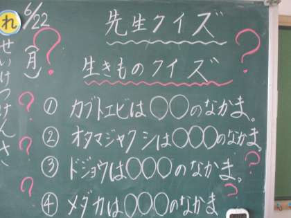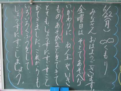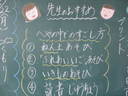 今日も、子供たちは一日教室の中ですごしました。それでも、子供たちは、屋内運動場の体育や、長い放課の「粘土あそび」や「生き物あそび」などで、とても楽しく安全にすごすことができました。来週も、遊ぶ環境を設定してあげて、楽しくすごししてほしいと思います。