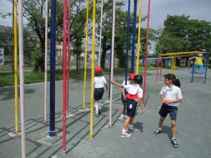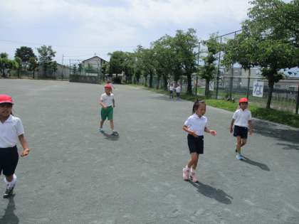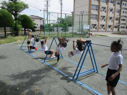 今日の午後から、運動場で体育をしました。「しっぽとりあそび」「てつぼうあそび」「ボールあそび」などを水分補給を何回もしながら、楽しく活動しました。最後は、汗びっしょりになりました。