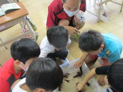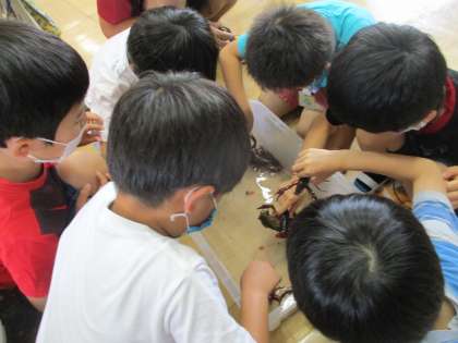 2年生の生活科では、「生き物をかおう」の単元で、「アメリカザリガニ」や「カブトムシ」「クワガタムシ」「ドジョウ」「メダカ」などの生き物を地域の用水や田んぼで採集して、教室や渡りで飼育しています。