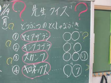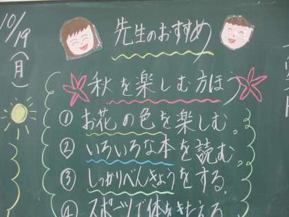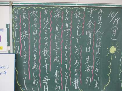 今日は一週間の初日でした。急に気温が下がり、長そでやカーディガンやウインドブレーカーなどを着ている子が多くなりました。これからは、毎日の気温差が大きくなるので、服装の調整が難しいです。でも、放課になると、ほとんどの子が運動場で汗をかいて遊んでいました。さすが子供は風の子です。