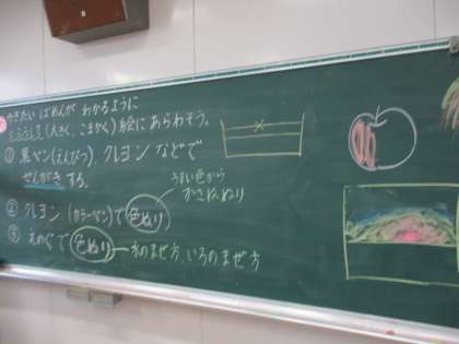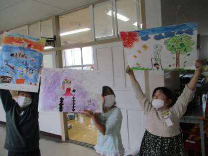今日の図工は「ミリーのすてきなぼうし」の感想画を描きました。教科書の挿絵にこだわらず、物語の内容から想像した絵を描きました。一人ひとりいろんな絵が完成しつつあります。