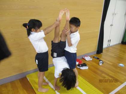 逆立ちといっても一人でする訳ではなく、安全に配慮しながら、友達とサポートし合いながら逆立ちの感覚をつかむだけのものです。しかし、子ども達は壁から足が離れると「できたー!!」といって大変喜んでいました。少しずつ様々な動きの感覚を身に付けていけるよう支援していきたいと思います。