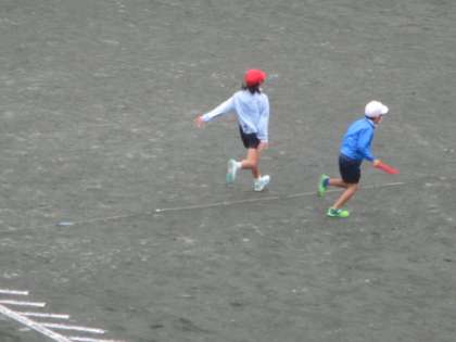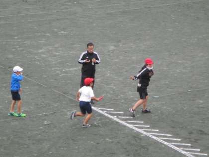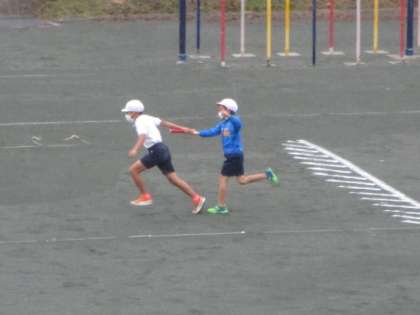 リレーを行っています。グループごとに協力しながら、バトンパスの練習をしています。