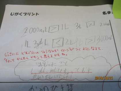 3枚目:かさの学習を行いました。「L,dL,mLはちょっと難しい単位でした。」