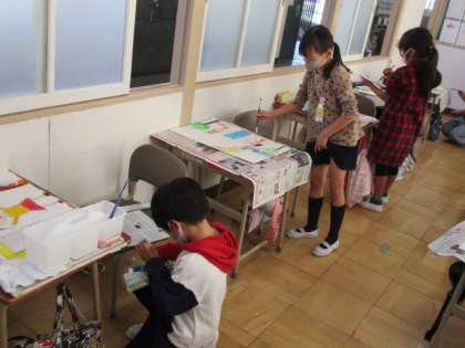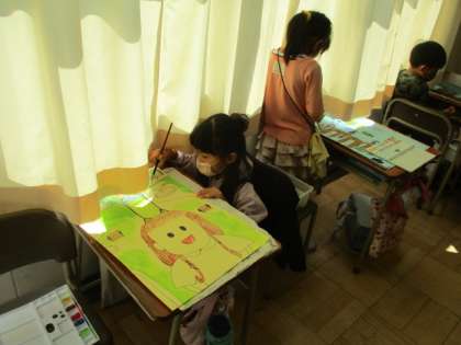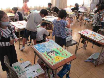 えのぐの混色の仕方や筆につける水の量に気をつけながら、画面全体に彩色しています。