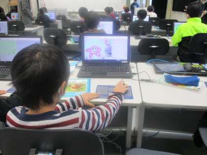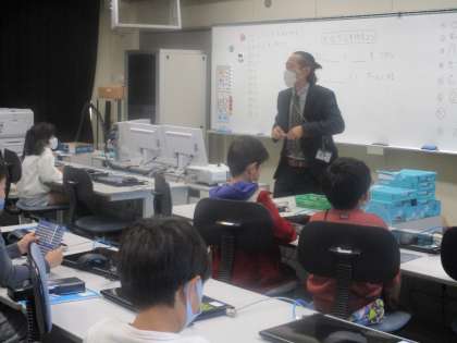 算数の授業で学習したことを定着させるため、子どもたちがプログラミングソフトを使って九九ゲームを作成しました。作成後は、お互いのゲームをやって、よさを実感していました。