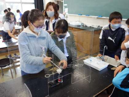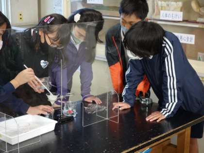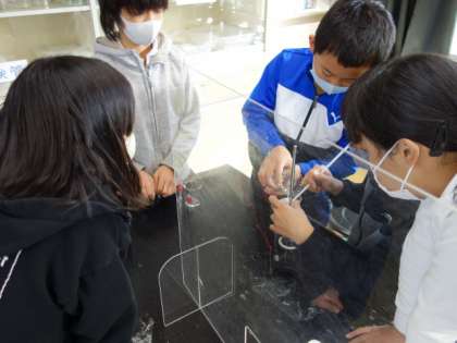 水にとけずに残った物を、ろ過で取り出す実験を行っていました。