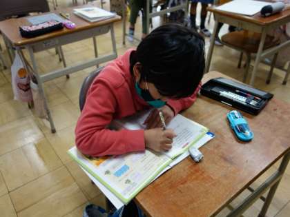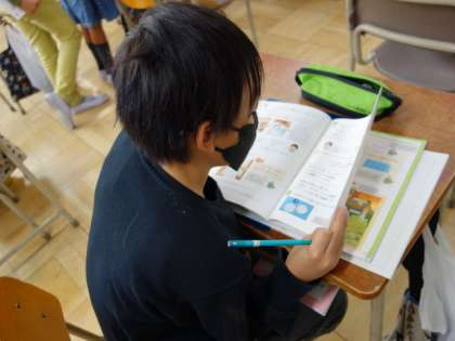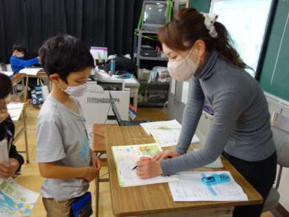 まとめの問題を解き、先生のチェックを受けていました。