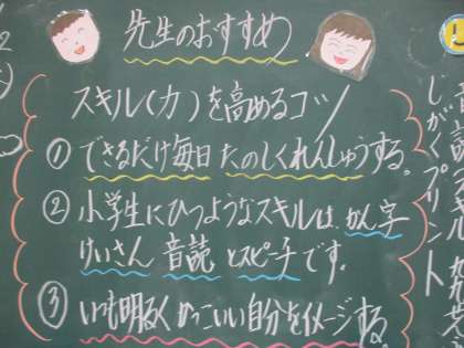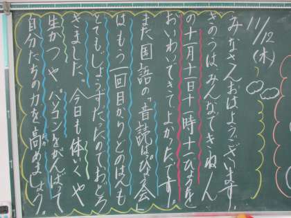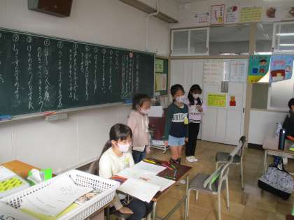 最近は、子どもたちの持ち物の中に、あるアニメのデザインをしたものがとても流行っています。ストーリーは、少し残酷なめんがあるので取り上げませんが、子供たちがキャラクターの絵を描いたり、テーマソングを歌ったりしているので、休み時間に、そのことを話題にしたり、一緒に歌ったりしています。また、1時間目には、物語文「わたしはおねえさん」の2回目の音読発表会を行いました。子供たちはとても意欲的に発表できました。