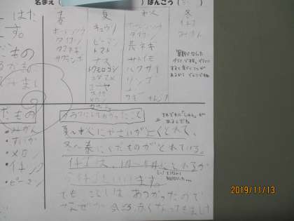 2枚目:野菜の旬について調べました。ご家族の畑でとれる野菜を季節ごとに並べたグラフから、野菜と果物の取れる季節に気付きました。